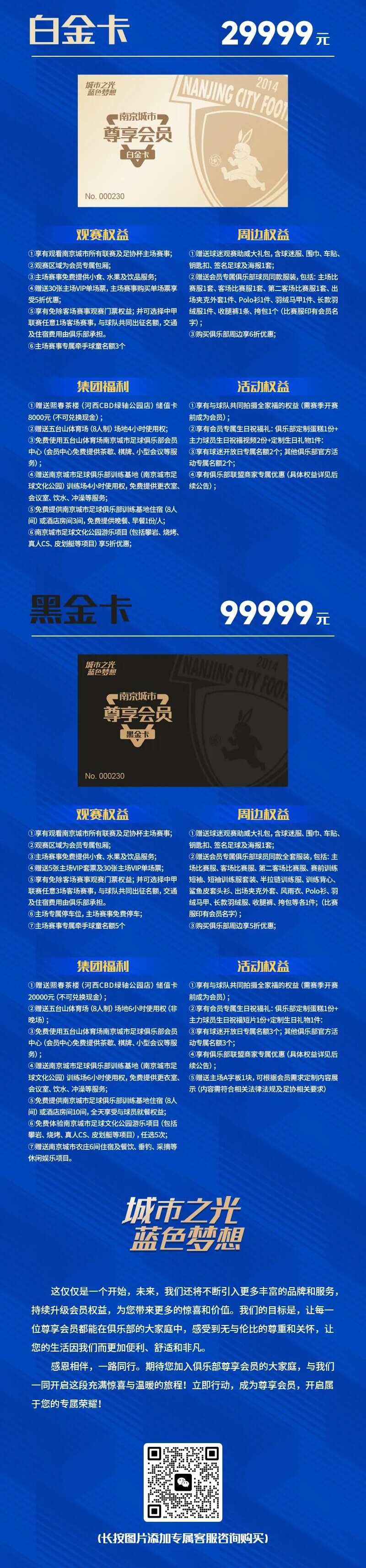 中甲俱樂(lè)部南京城市公布了多項(xiàng)付費(fèi)俱樂(lè)部會(huì)員方案,其中最低檔會(huì)員為9999元的銀卡,最高檔會(huì)員為99999元的黑金卡,俱樂(lè)部稱會(huì)員可享受全年免費(fèi)包廂觀賽等多項(xiàng)權(quán)益。