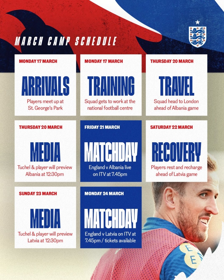 英格蘭隊(duì)本次集訓(xùn)日程: