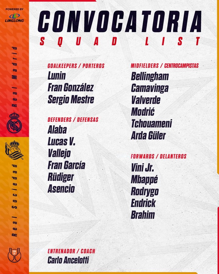 皇馬國王杯大名單:庫爾圖瓦、塞巴略斯缺陣,姆巴佩、貝林領銜
