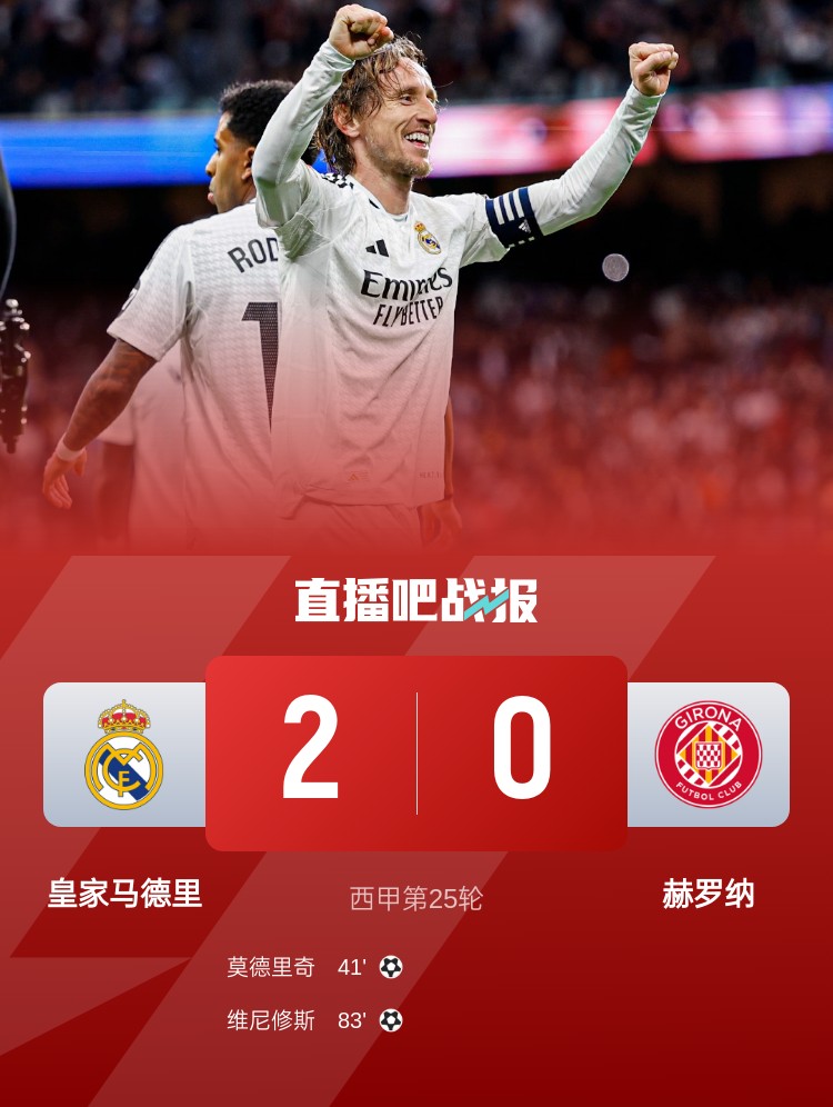 西甲第25輪,皇馬2-0赫羅納。上半場,庫爾圖瓦救險撲出范德貝克近距離射門,莫德里奇世界波破門;下半場,姆巴佩助攻維尼修斯破門
